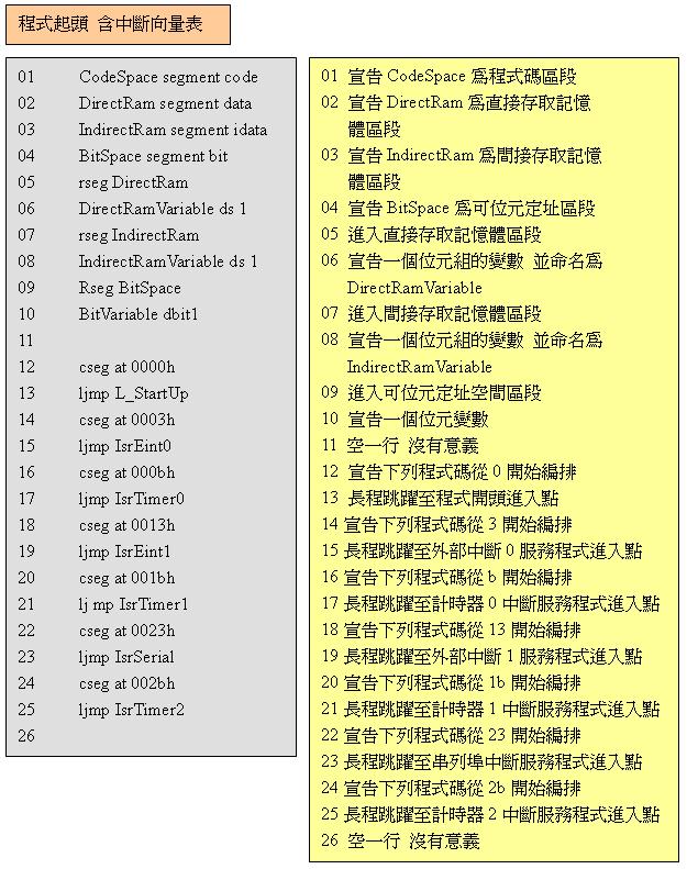 下圖是我解釋8051程式的圖像,看得懂得恭喜,看不懂的是我表達能力有問題,不是你的問題,哈哈哈。 程式碼分四個部份:中斷向量表,主程式,副程式,中斷副程式。 Reset後程式會從 org 00h開始執行,接著跳到CodeStartAddress執行,做記憶體的初始化。之後,便進入main()中開始程式的運作。程式運作時會執行 xxx service的副程式,不同的物件會有不同的service副程式以滿足程式控制的需求。
